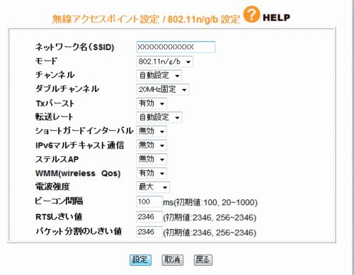 無線LAN セキュリティを設定します。 SSID(Service Set IDentifier)は出荷時に機器固有のID番号が振られていますが、当然変更します。 設定画面 =>「LAN 側設定」=>「無線アクセスポイント設定」=>「802.11n/g/b 設定」の順にクリックします。 新しく設定…