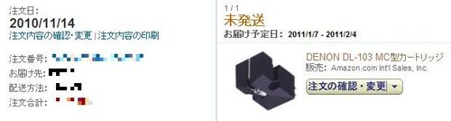 2010-11-14 に amazon に注文した DENON DL-103 MC カートリッジの発送時期が延びました。 Amazon.co.jp をご利用いただき、ありがとうございます。 誠に申し訳ありませんが、ご注文いただいた以下の商品の入荷遅延により、お届け予定日を変更させていただき…