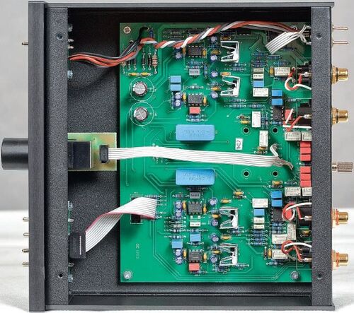 Pro-Ject 社 Phono Box RS の画像を検索していると、入力抵抗用の可変抵抗器の取り付け方やパーツ類に 2種類あることに気がつきました。 本体を開けます。さてどちらかな? うーん、コストダウン量産タイプですね。 使用している OP AMP は文字が薄くて判明…