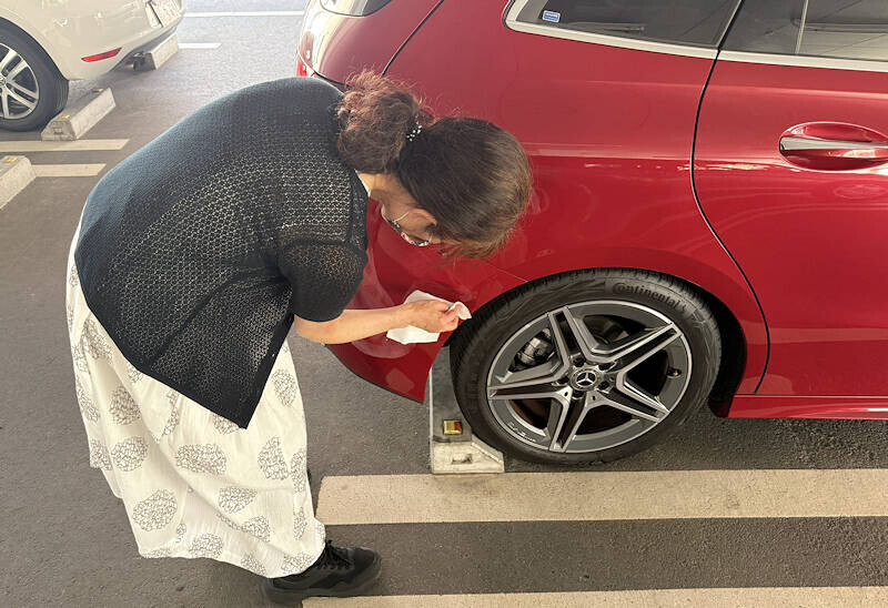 査定に 30分ほどかかりますので、その間に 1F の駐車場で 車の傷を コンパウンド掛けします。ここなら 灼熱の直射日光の餌食にはなりません。 下の写真の部分ですね。