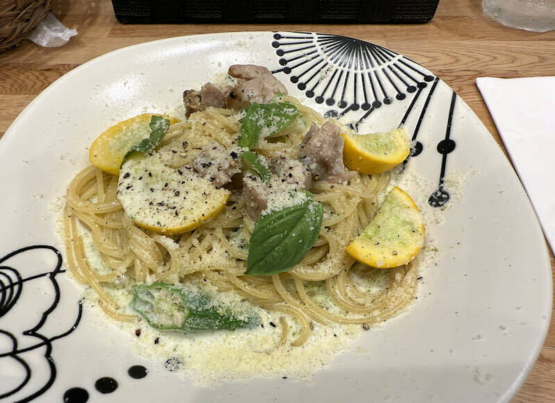 メインの鶏肉とズッキーニのパスタ。ソースも美味しい。